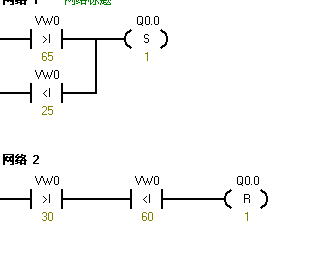 假設報警是Q0.0,那么就是在大于65或者小于25置位Q0.0,在大于30且小于60復位q0.0