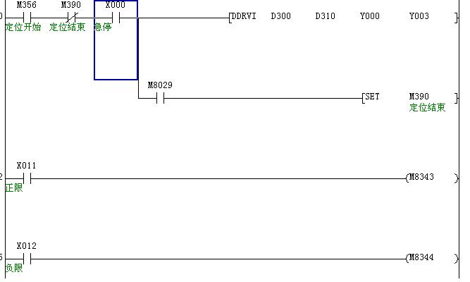 請問各位在如下的程式中,如果正在定位的執行過程中,定位開始的M356突然斷開或是因為急停觸發導致定位減速停止,這時候定位異常結束標志位M8329會置ON嗎? 手冊上好像只說到只有當觸發到極限位,即圖中的X11和X12時而導致定位被迫停止時M8329才會置ON一個周期,不知當觸發觸點斷開時是否也會使M8329置ON?  謝謝各位!