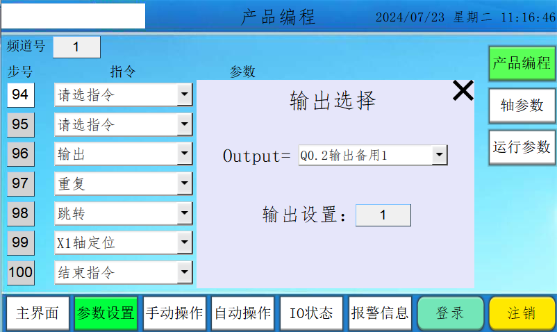 一般帶一到兩個參數,原點  結束指令是無參指令。編程時坐標可以示教,程序可以 步插入  步刪除  頻道復制  頻道刪除。