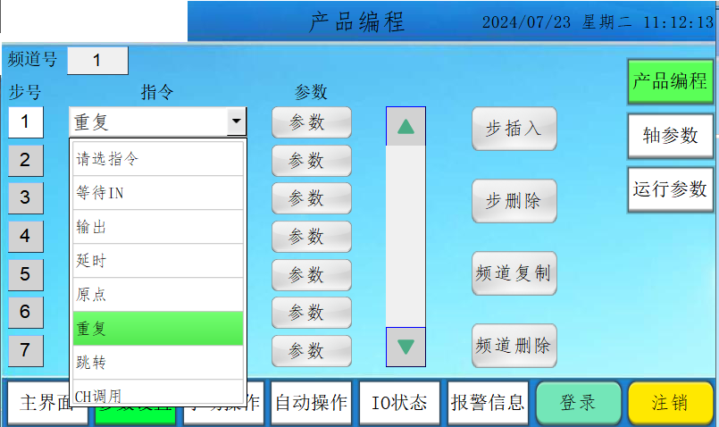 回原指令寫完,在觸摸屏上編程測試,重復指令,跳轉指令,頻道指令,定位指令。頻道1用了3個嵌套重復,運行頻道1調用了頻道2需要運行8個小時完成,測試了3次都能正常工作完成。