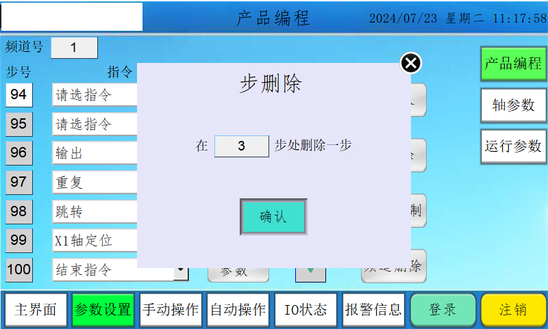 觸摸屏上數據的存和取在PLC的HMI設置程序里寫好,步號最大100,可以自由設置,指令有:等待IN  輸出  延時  原點  重復  跳轉  頻道調用
