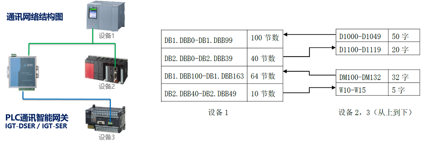 西門子PLC與三菱Q系列PLC跟智能網(wǎng)關(guān)模塊之間是以太網(wǎng)連接,歐姆龍PLC跟網(wǎng)關(guān)之間是串口連接。