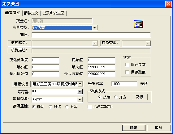 我編寫一個組態王和三菱1S PLC的通信問題,組態王可以啟動和停止PLC,就是改寫不了和無法顯示定時器里面的數值,可是我用觸摸屏就可以改寫,組態王里面的變量類型我設定的是:I/O整數,寄存器D0,數據類型:SHORT,讀寫類型:讀寫;模擬輸出:整數2位,十進制;模擬輸入:最大100,最小0.