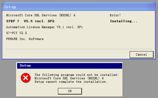 安裝STEP7 V5.5時,出現這個錯誤,(Microsoft core XML Services(MSXML)6 ERROR .重裝了系統還是不行,哪位高人知道原因,幫助解決一下。謝謝了。