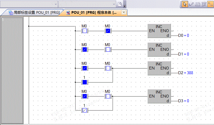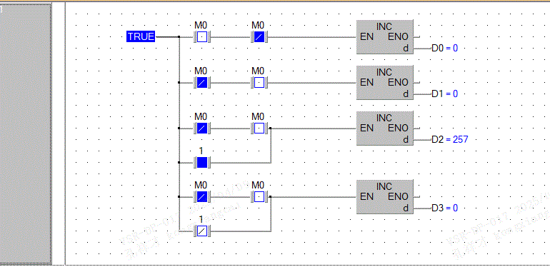 你意思是既然都一直導(dǎo)通,同樣的運(yùn)行時(shí)間里累加的結(jié)果應(yīng)該一樣,這個(gè)不知道是不是通訊延遲造成。把這程序下載進(jìn)PLC再讀回來發(fā)現(xiàn)編譯的結(jié)果完全不是我們想象的樣子
