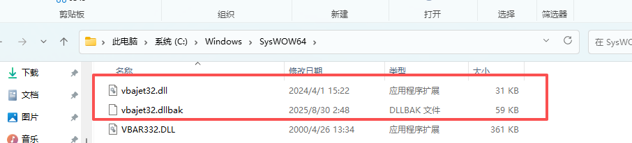 重新安裝軟件時發現報C:\Windows\SysWOW64\vbajet32.dll拒絕訪問,接著百度搜了一下,發現是win11系統更新時把這個dll文件更新了,于是我想著替換掉這個文件回老版本行不行呢,于是就試了一下,結果發現是可以的。