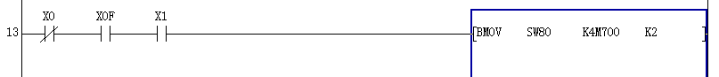引用引用第2樓cuiyl于2008-11-07 09:05發(fā)表的 : 如果是BMOV SW80 K4M700 K2 意思就是傳送特殊連接繼電器sw80 開始 到 k4m700 =m700-m715 傳送位數(shù)k2=2個(gè)16位 結(jié)果就是從sw80開始到sw112的開和關(guān)也就是0.1數(shù)據(jù)映射到m700開始到m732上面。本人表達(dá)能力不行請(qǐng)多包涵!
