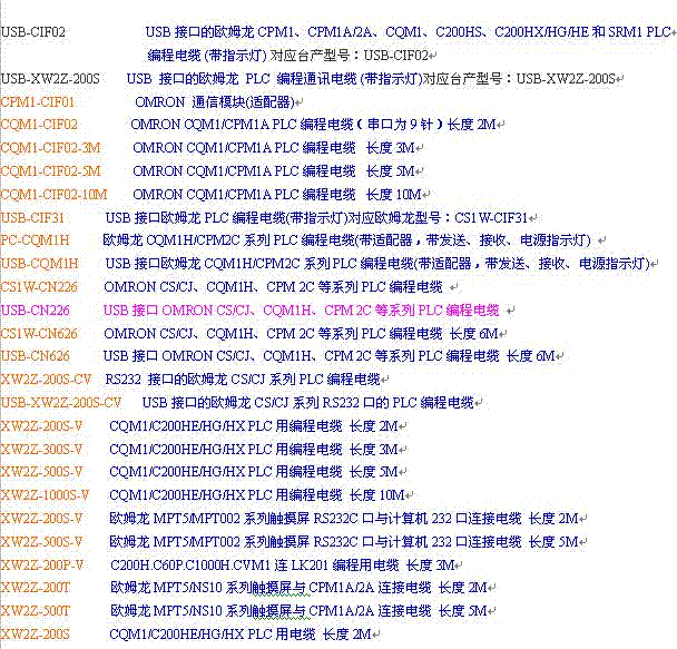 請問,使用OMRON PLC的同行們,有ONRON各種PLC的編程電纜型號及其適用對應型號的PLC清單嗎?因為我想買根PLC編程電纜,但不知道買什么型號的,想對應的看下,好查找什么樣的編程電纜適用我目前使用的OMRON PLC,希望能夠得到幫助!1
