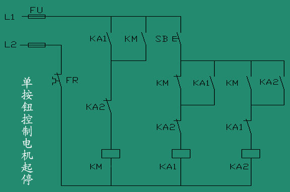 按下時ka1吸合,km自鎖,ka2斷開。松開時ka2自鎖,電機啟動,再按時ka1使ka2斷開