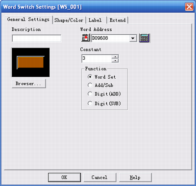 D0現在畫面號碼 D1狀態錯誤 D2時鐘資料(現在) D3狀態D4保留(寫入) D5切換到畫面號碼 D6畫面顯示ON/OFF D7時鐘資料(設定) D8控制 D9保留(讀取) D10視窗控制 D11視窗登錄號碼 D12視窗位置 一般使用D8進行人機畫面切換,寄存器起始位址可以自行設定,我這里使用D0,你也可以使用D100 那么切換畫面控制的就是D108了以此類推. |