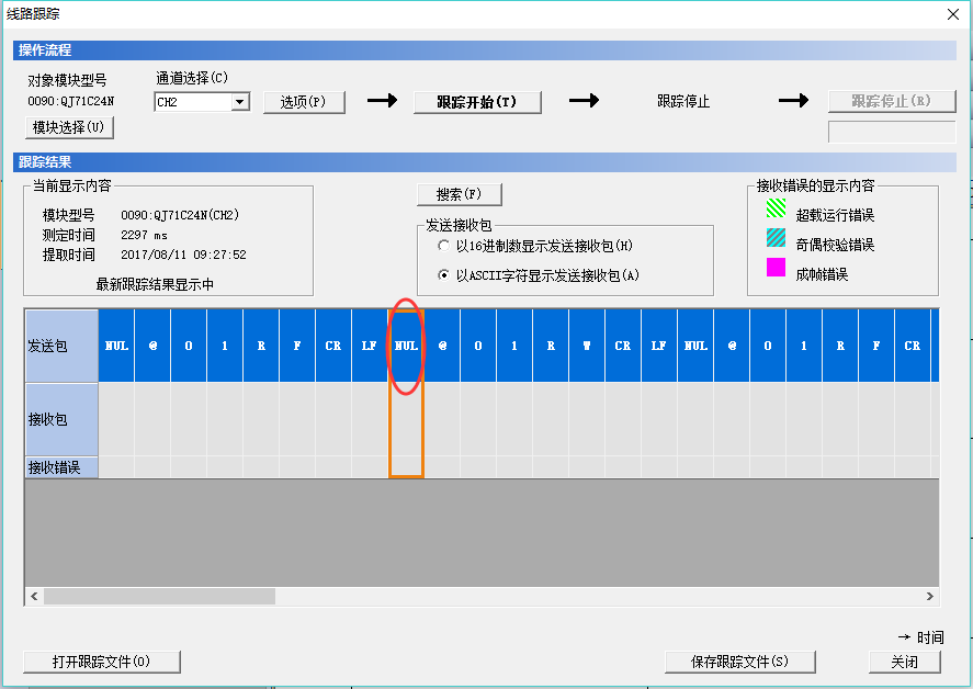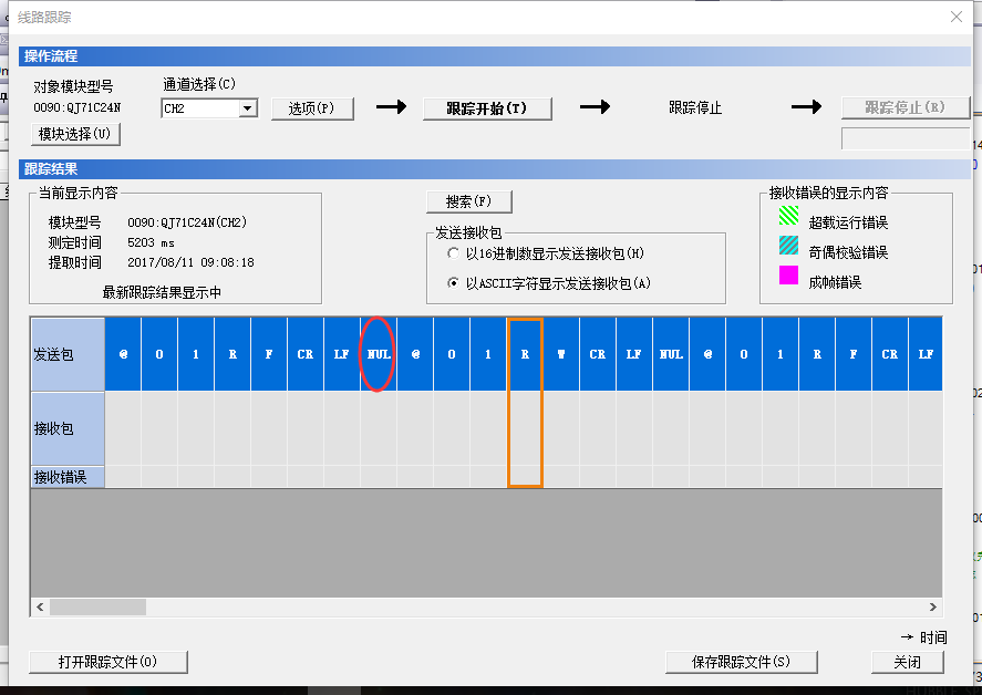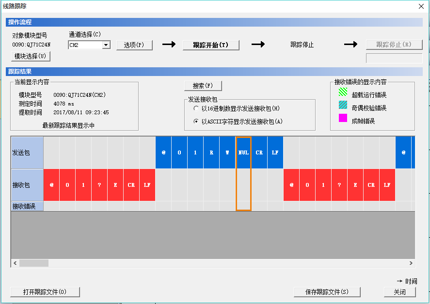 儀表接收的報文格式是@01RW,停止符可選擇CR和CR LF這兩種,當只用CR作為停止符時是可以通訊上,并讀到正確的數(shù)據(jù),如圖
