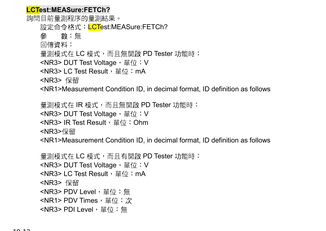 設定命令格式:LCTest:SOURce:CURRent {<NRf>|MIN|MAX}參數:<NRF>,為0.5~50(mA)可接受 MAX:50mA,MIN:0.5mA回傳資料:<NR2>單位 mA