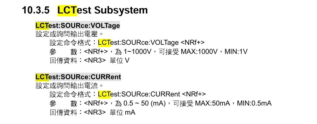 設定命令格式:LCTest:SOURce:VOLTage {<NRf>|MIN|MAX}參數:<NRF>,為1~1000V可接受 MAX:1000V,MIN:1V