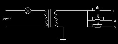 完整的電路圖如圖,它是一個早期的利用變壓器升壓的高壓捕鼠器,分三支路輸出,哪一支路電到老鼠時那一路的指示燈就發光,同時220V輸入端的燈泡也會發光;不過電阻值我忘了,只記得是幾十歐以下的,電阻兩端的電壓是受負載影響的。