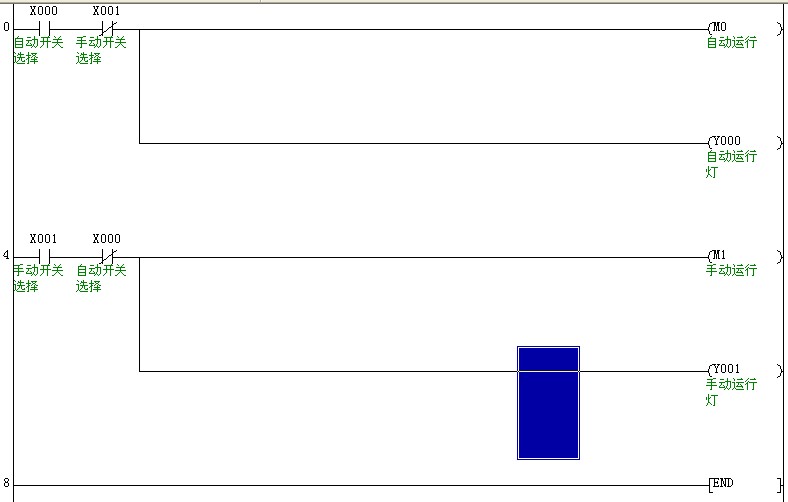 在編寫PLC程序的時候,可以編寫2段程序,一段滿足條件后,是自動運行,另一段滿足條件后,是手動運行,只要通過外圍的轉換開關來選擇手動或者自動就可以了。