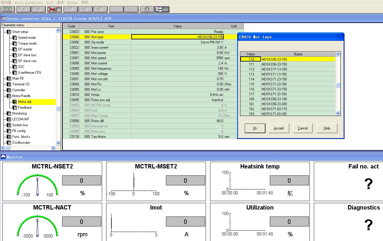 我司有一臺設(shè)備,是采用Lenze的伺服控制器(型號為:E94P040S2FEX)和伺服電機(型號為:MPST0506303)控制,前段時間該伺服電機燒掉了。現(xiàn)在我們買了一個同型號的電機來替換,但裝上后不能轉(zhuǎn)動,依照說明書和倫茨的工程師的建議,對電機做自動調(diào)整。可自動調(diào)整進行不下去。