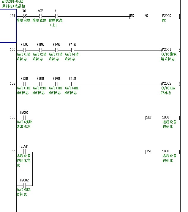 圖片: ![]() 各位大大!~求教啊 今天做實驗碰見一個傷腦筋的事, 我用 CC-LINK(型號:QJ65BT11) 鏈接6塊遠程模塊 (型號:AJ65SBTB1-32DT 、 AJ65SBT-64AD、 AJ65SBT-64AD、AJ65SBTB1-32DT、AJ65SBT-64AD、AJ65SBT-64AD)站號是:主站是0 、遠程模塊按上面的循序分別 1、2、3、4、5、6 CC-LINK 參數及站信息分別見圖1 、圖2 。 主站和CC-LINK 都沒報警,前面5塊模塊也正常(都有“請求標志返回”分別是 X138、X158、 X198)最后一塊模塊就沒 “請求標志返回”“X218” 程序就不能運行了。AD程序見 圖3。 我幫程序和軟原件分配表打包,那位大俠幫小弟看看問題出在那里。 |