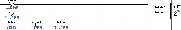這條程序的意思是不是說:不管是主控急停或者是手電門急停,系統(tǒng)都會進入急停位,而當(dāng)故障復(fù)位,主控急停解除,手電門急停解除,系統(tǒng)才能解除急停狀態(tài)。另外就是是后面那個“KEEP 11  HRO0.0 ”不是很理解 我看很多程序圖里面有類似符號   能幫忙解釋下么?