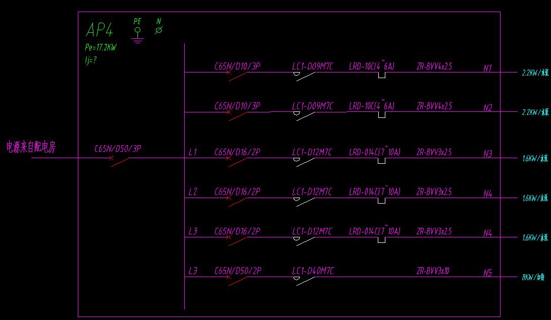 根據(jù)你的電氣圖,準(zhǔn)確的負(fù)荷是8KW+1.6KW*3+2.2KW*2=17.2KW,因為這是三相不平衡負(fù)荷,計算每相總電流比較復(fù)雜,但是要考慮最大負(fù)荷時的最大單相電流L3,總開關(guān)的電流滿足了L3,線路才能正常工作,I1(L3上加熱器)=8000/220=36.36A I2(L3上單相水泵)=1600/220*0.8=9.09A I 3(三相水泵)=2200/1.732*380*0.8*2臺=8.36A、總單相電流為I1+I2+I3=53.81A,總開關(guān)選DZ47-60-D60-3P可以滿足要求。