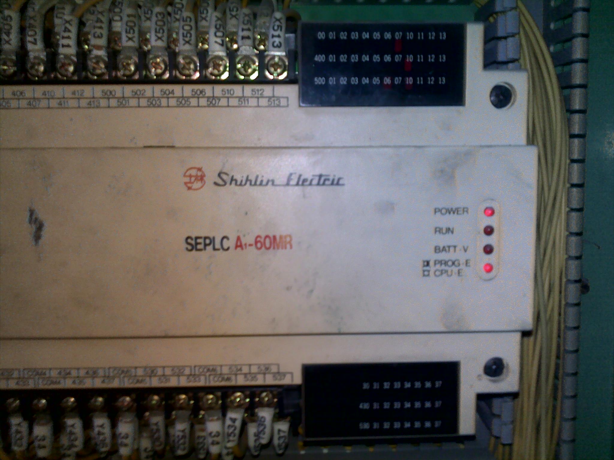 士林老式PLC,BATT-V燈亮了就表示電池沒電了,電池沒電程序就會丟失,所以CPU-E,PROG-E的燈還會閃。可以到別臺拷一份程序灌進去。你這應該是沖床上用的吧?