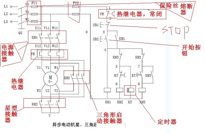 引用引用樓主老大很悲傷于2012-08-22 14:33發(fā)表的 星三角啟動 : [attachment=90719]圖中的星三角啟動,KM1 , KM2 , KM3 ,我知道其中兩個是星形與三角形啟動的相互轉換用的繼電器,但多出來的那個繼電器是做什么用的,還有,圖中三個繼電器各是起什么作用,我實在是分不清楚~~~請大俠指導~~~