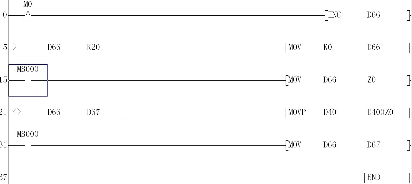 已知數據寄存器d66中的數據從1遞增到20,d40中的值隨時間變化,現在我想把d66從0變到1的瞬間把D40的值賦給D400,從1到2的瞬間把D40的值賦給D401,以此類推,直到D66值變為20,開始下一循環。我目前的單段寫法如附件圖中所示,從節省掃描周期的角度,哪位有更簡潔的做法?我目前的做法,要寫20段,每段占14步