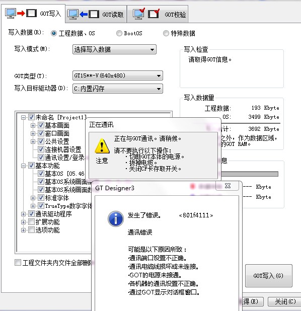 我準備GOT寫入時,該勾的信息都勾了,然后寫入,電腦上出現(xiàn)通訊錯誤,觸摸屏上,先顯示,請安裝基本OS——正在安裝——安裝完了——觸摸屏重啟——又顯示請安裝基本OS。求哪位大神,幫幫忙。我用的是GTdesight3