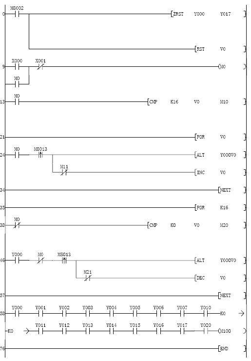 好像不行,V0到了16停止不了,我做了一些修改,我仿真測試的時候看到Y(jié)20也一直在交替輸出,為什么?還有就是在啟動的過程中按停止或者在停止的過程中按啟動會有錯誤動作,為什么?那位老大賜教一下,謝謝。(各位老大不要拍我磚頭啊。
