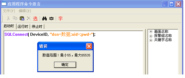 命令語(yǔ)言——應(yīng)用程序命令語(yǔ)言——啟動(dòng)時(shí):SQLConnect( DeviceID, "dsn=數(shù)據(jù);uid=;pwd=");   —— 確認(rèn)“彈出錯(cuò)誤,數(shù)值范圍:最小55,最大65535是哪不對(duì)? 哪位大神幫忙看看,謝謝!!