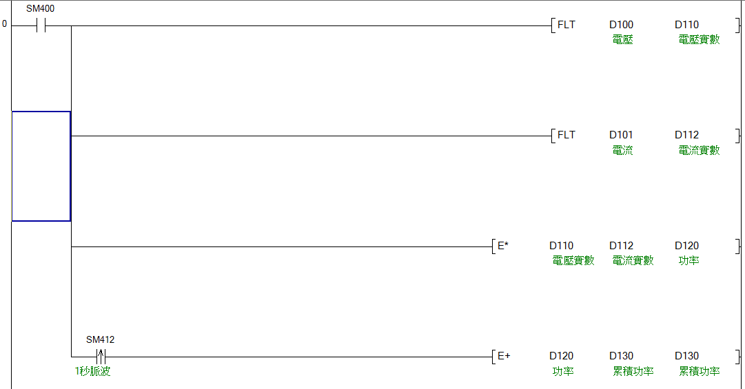 我提供一個思路給你吧:首先,用電量=電流*電壓*時間,你只要將D100乘以D101再乘以一個時間這樣就可以算出來了啊,但是記得單位的變換也就是說最后再除以一個數值就可以了。
