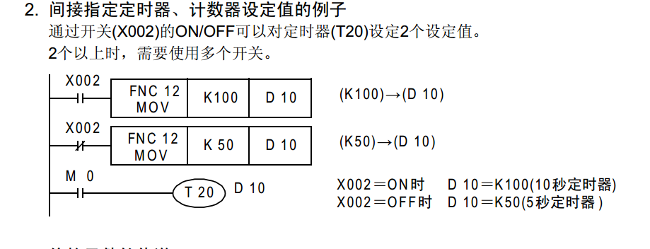 通過(guò)開(kāi)個(gè)X2的ON/OFF可以對(duì)定時(shí)器T20設(shè)定兩個(gè)值。(見(jiàn)下圖,三菱編程手冊(cè)第221頁(yè)。)