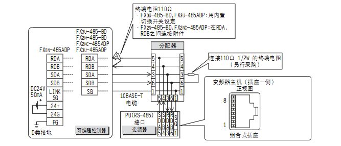 連接時,如果電磁干擾不強的情況下,可以使用網線,一頭直接與485BD板連接,另一頭裝水晶頭后,插入變頻器的PU接口。線路長度不超過50m的情況下,可以不裝終端電阻。