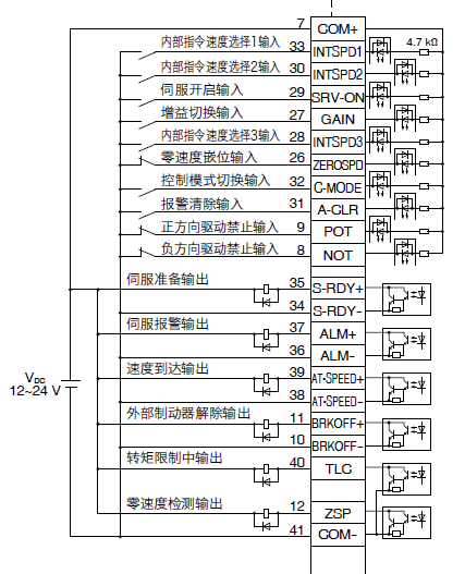 伺服的輸入信號用繼電器轉(zhuǎn)一下,輸出信號接的時候“-”端接PLC輸入、“+”端接DC24V,伺服的輸出都是無源觸點,如果PLC的輸入端是NPN的,則把“+”接到PLC上,“-”接到DC0V上,如果PLC的輸入是PNP的,就是“-”接PLC、“+”接DC24V