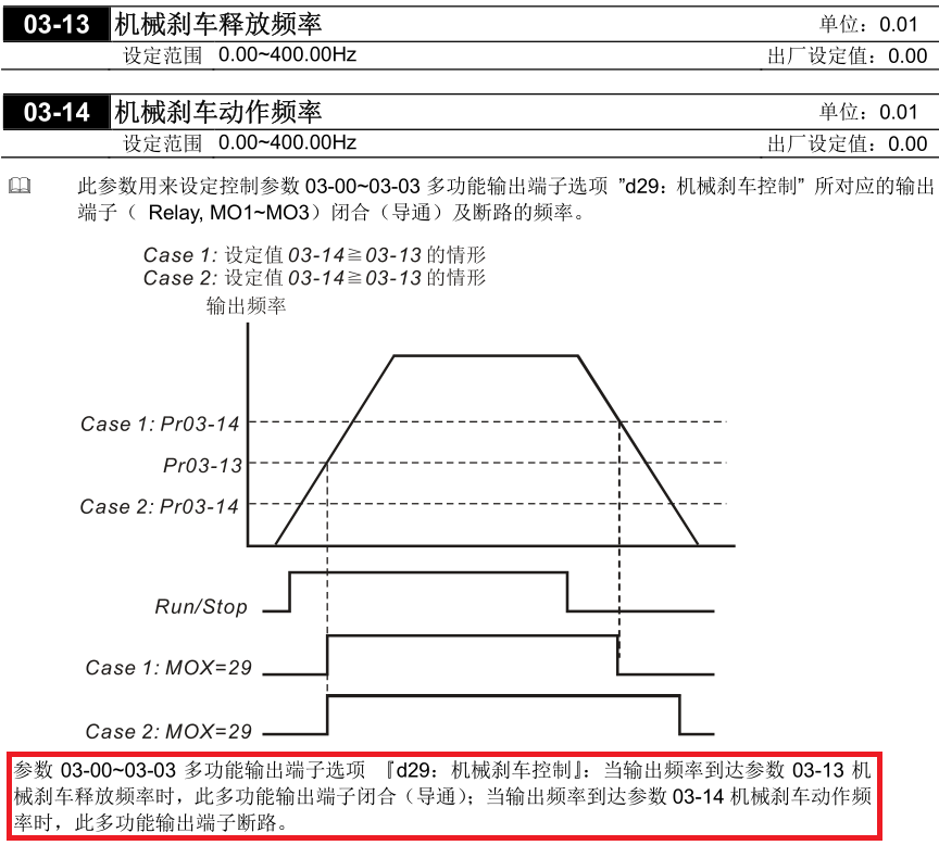 ![]() 參數 03-00~03-03 多功能輸出端子選項 『d29:機械剎車控制』:當輸出頻率到達參數 03-13 機 械剎車釋放頻率時,此多功能輸出端子閉合(導通);當輸出頻率到達參數 03-14 機械剎車動作頻 率時,此多功能輸出端子斷路。結合圖表怎么理解。個人理解應該是 03-13>03-14,因為:03-13 為剎車釋放頻率,03-14剎車動作頻率,剎車釋放頻率>剎車動作頻率,這樣當輸出頻率小于3-14時剎車動作。 [ 此帖被worker02在2018-11-26 13:58重新編輯 ] |