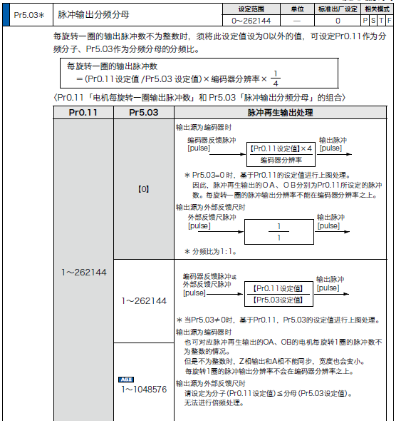引用引用第1樓jinle520于2019-11-02 08:25發(fā)表的 :好好理解這幾句話,Pr5.03=0時(shí),Pr0.11為馬達(dá)旋轉(zhuǎn)一圈輸出的脈沖,就是想多少就改多少就行,默認(rèn)是旋轉(zhuǎn)一圈輸出2500個(gè)脈沖。當(dāng)Pr5.03不等于0時(shí),才用那個(gè)紅框內(nèi)公式算。