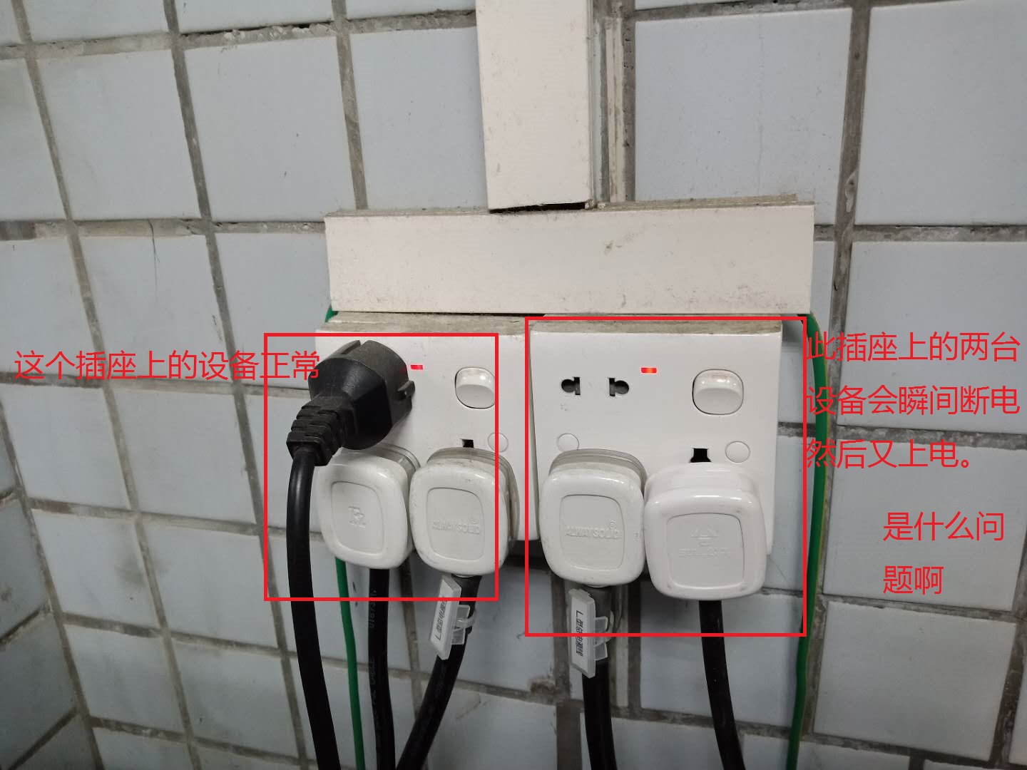 瞬間斷電又重啟是什么問題,如圖右邊插座會瞬間斷電又上電,是不是插座帶不動還是接觸不良。