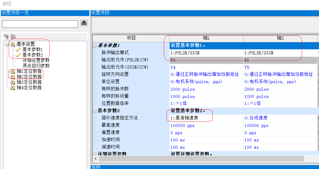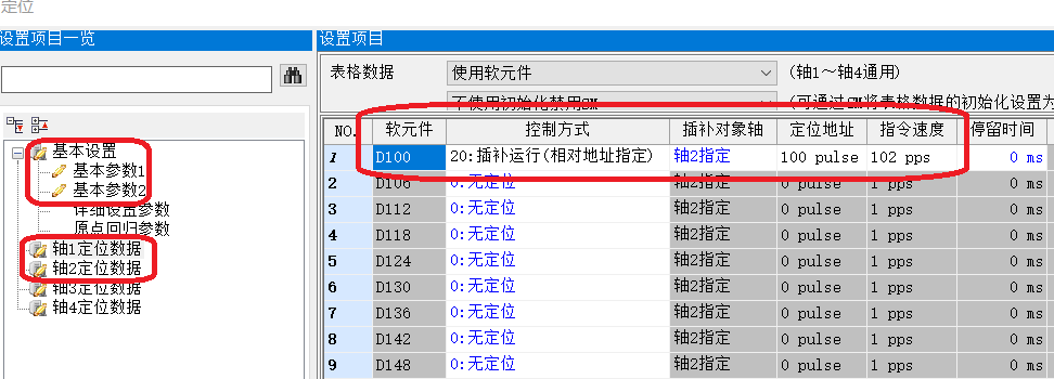 2-3、點擊“軸1定位數據”,“軸2定位數據”,設置使用軟元件,控制方式,插補對象軸,定位地址,指令速度等