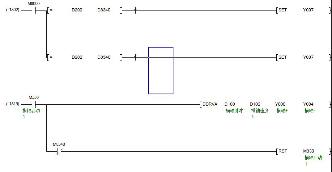用高速比較指令輸出,還有就是程序怎么這樣寫兩個SET Y7呢?雖然SET沒有雙線圈,但也會出現程序不穩定情況。
