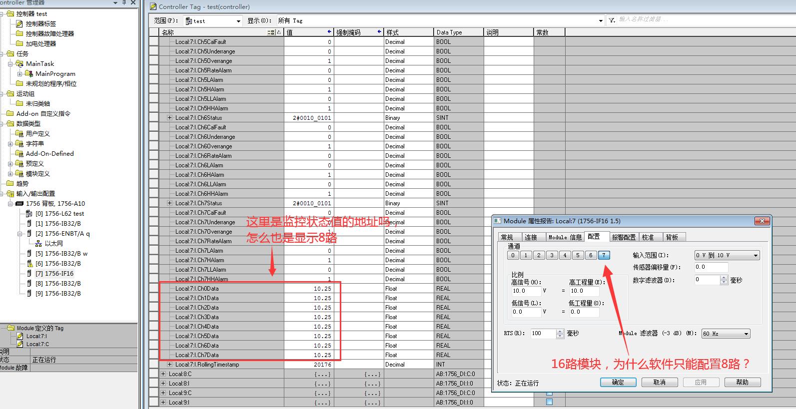 初次使用AB的模塊,IF16是16路輸入,為什么模塊的屬性里只能設置8路的輸入信號?軟件里在哪里可以監控到轉換的數字值,我看標簽里顯示的也是8路,是在這里監控轉換后的數字值嗎?我吧27端子接負,36端子接3V正,軟件的CH7data里顯示是的卻是8.7,這是怎么回事?