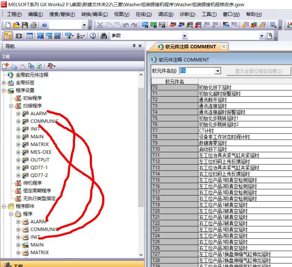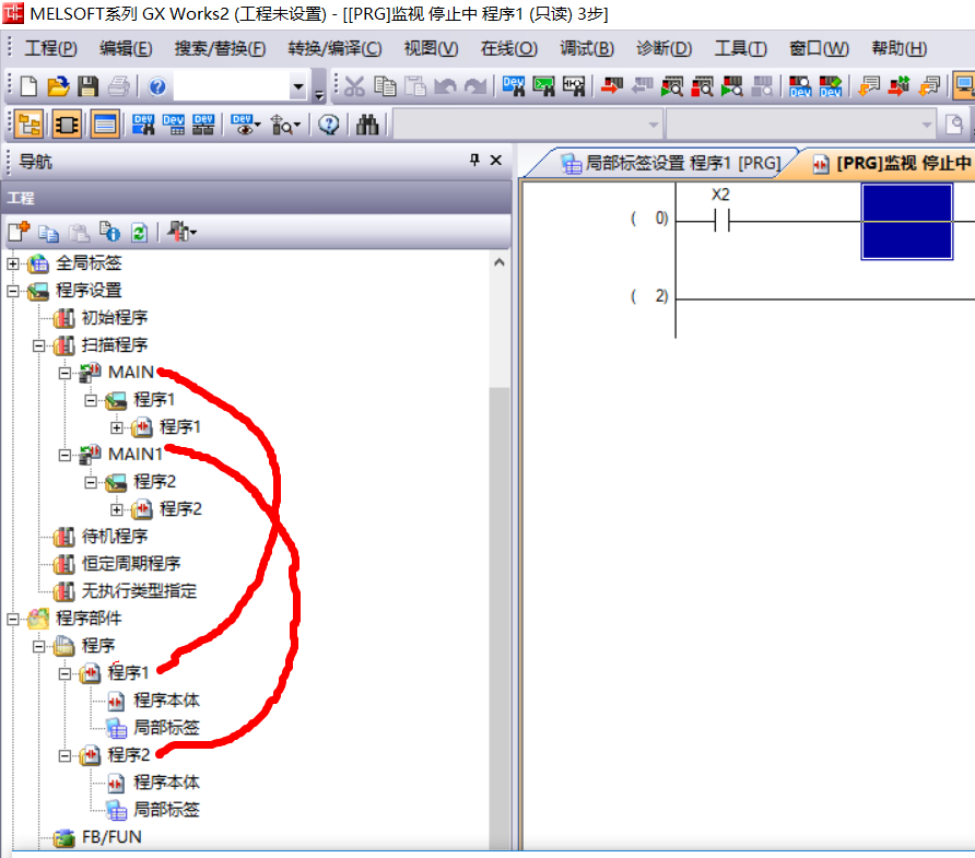 新建多個程序塊,在PLC參數設置里不能直接設置程序類型,只能右擊程序--程序登錄--選擇程序類型;或者拖拽到樹狀圖掃描程序中
