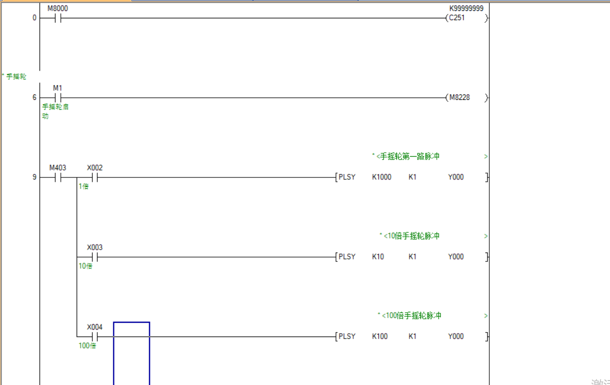 模仿數控系統電子手輪控制方式,PLC程序應該怎么寫?條件使用三菱FX3G,Y0為輸出脈沖接口,Y4方向接口。例如1、手輪選擇x1倍率手輪轉動一格發出一個脈沖,PLC輸出1個脈沖。2、手輪倍率選擇x10倍率手輪轉動一格發出10個脈沖,PLC輸出10個脈沖。同時D8340做為絕對坐標數,手輪正轉D8340數值脈沖增加,反之減少。已解決
