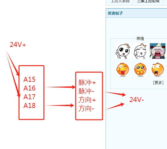 測試出來了,A15-A18是PLC電源直接給的5V,不需要外部電源搞在一起,也就是A15到步進脈沖正,然后脈沖負回到A16就行。