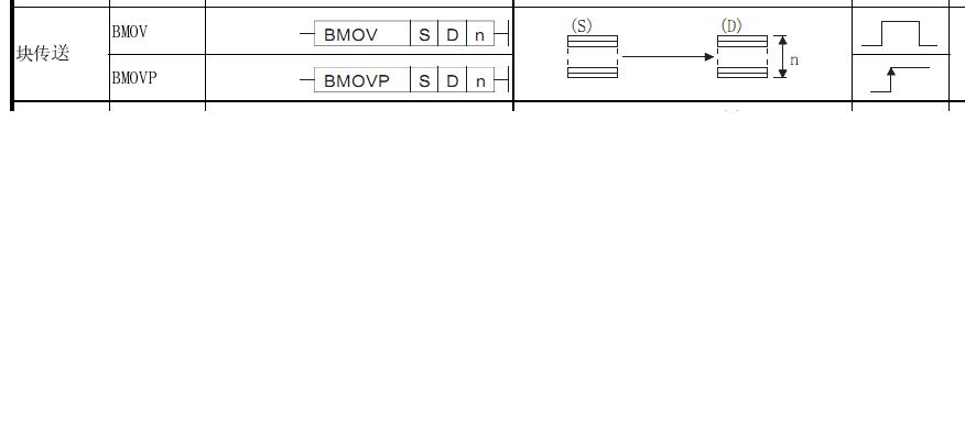 BMOV D0 D9 K8(BMOV是塊傳送指令)將D0至D8傳送到D9至D16中去,P就是脈沖指令。