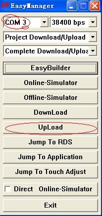 你安裝好編程軟件后同時還會有圖1中的那幾個程序,運行紅圈的那個EM程序,會出現圖2的界面,選好你的COM口,再點UpLoad就可以了,當然,如果之前屏里的程序有密碼的話還會叫你輸入密碼。