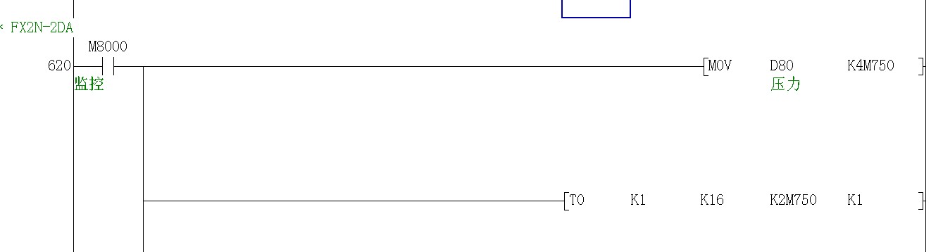 D80的16位2進制數值來控制M750-M76516個中間繼電器的通斷,將低8位,即M750-M757的位信號數據寫入到D/A模塊