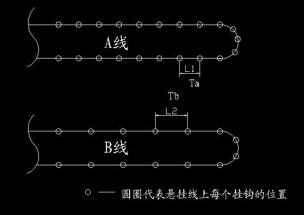 如圖, A線,B線分別代表兩條懸掛鏈線,分別由1臺(tái)變頻器+1個(gè)馬達(dá)帶動(dòng)運(yùn)行,每個(gè)圓圈代表掛鉤的位置,因?yàn)楣に囈,其中L1不等于L2。為了讓兩條懸掛鏈線運(yùn)行時(shí),每個(gè)圓圈代表的掛鉤走到下一掛鉤位置所需的時(shí)間Ta、Tb (簡(jiǎn)稱步距時(shí)間)要一樣,需要A線變頻器與B線的變頻器的運(yùn)行頻率不相等(分別用Fa與Fb表示),會(huì)成一定的比例關(guān)系(如Fa/Fb=K,K為常數(shù))。