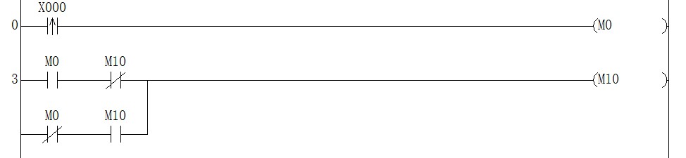 這個電路利用PLC的掃描周期實(shí)現(xiàn)功能M10交替動作的,當(dāng)按下X0,M0的一個掃描周期動作,當(dāng)M0動作通過M10的常閉使M10動作.當(dāng)下個周期來的時(shí)間,M0失電,M0的常閉串聯(lián)M10的常開使M10維持有電,