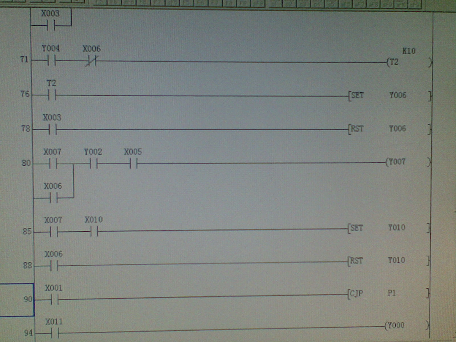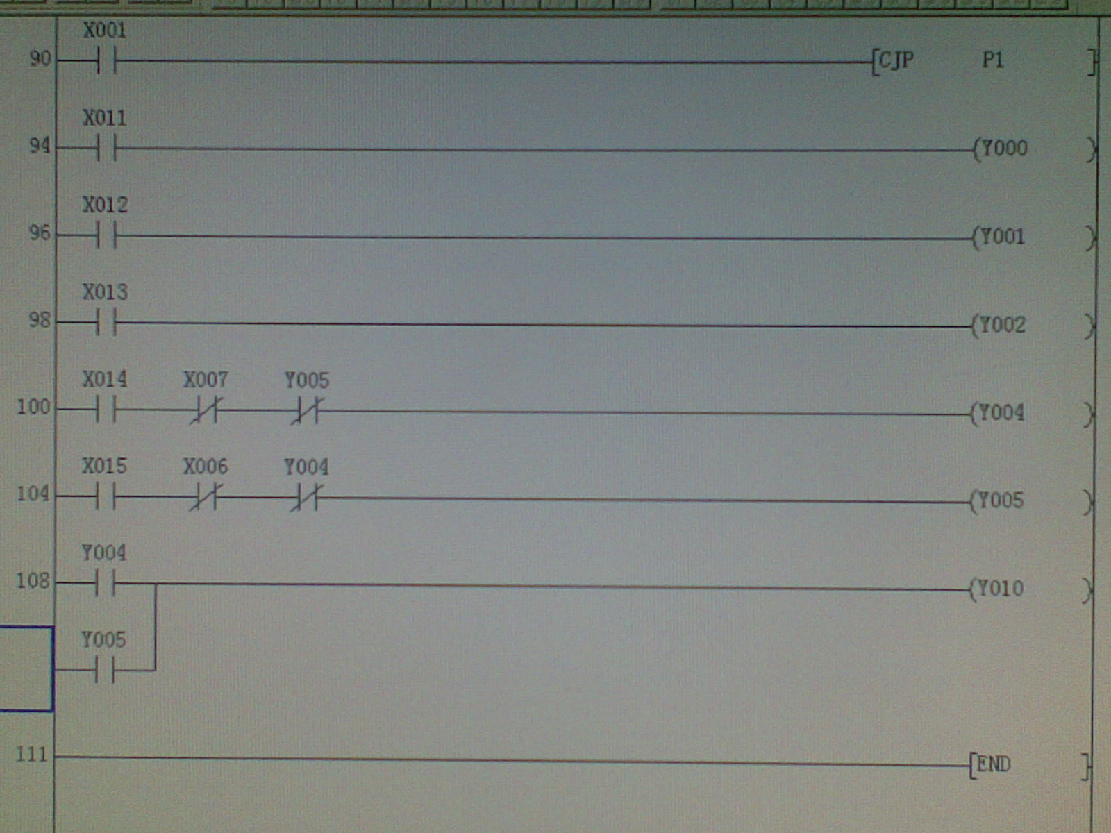 各位老師傅你們好!本人是一個三菱PLC編程初學者,想在做一臺磨角機,功能有手動/半自動/全自動三種,用一般的梯形圖已編好也可用,但看起來比較復雜,現在想改用跳轉指令編程,這樣看起來好看一點,不用點那么多內存,也可用雙線圈,手動/半自動編完后仿真時顯示程序出錯,提示CJ、CALL沒有跳出位置,但不知錯在哪里,改來改去也改不好,包括加了FEND指令后還是顯示出錯,看書上的也是云里霧里看不懂,希望各位師兄弟能指導指導,看一下該改哪一步哪些地方,下面是本人編的程序(因我前幾天發的沒人幫忙,今天只好又以照片形式上傳):