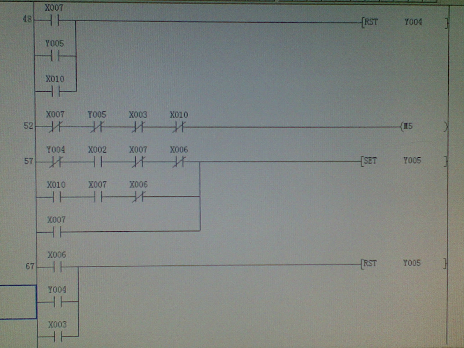 工作過程是(半自動):按下啟動按鈕X2,(啟動條件:擺臂上抬在上原點X3通,油泵驅動的擺臂在上限程X6接通),Y0氣閥得電擺臂內進(氣動)X4通,Y1氣閥得電擺臂下壓X3斷開,擺臂下到位X5通電,Y0失電擺臂外擺靠上需打磨的產品(四角盆內面),X4斷開Y2得電磨頭電機運轉(磨頭電機裝于擺臂上),油泵電機Y3接通運轉,下行油閥Y4得電,開始往下打磨,磨頭下行離開X6后外接的計數器電源接通,打磨下行碰到X7后Y4斷電,Y5通電磨頭上行,同時Y7通電外接的計數器加1,上行碰到上限X6磨頭下行,Y7得電輸出外接計數器加1。。。。。。計數滿足后打磨停止,Y0氣閥得電擺臂內擺,壓住X4,磨頭停止,如磨頭在下限X7處則磨頭上行到X6處停止(如磨頭在X6處則無此動作), Y1氣閥斷電擺臂上抬,壓支X3后Y0氣閥失電,計數器電源Y6停止輸出,擺臂外擺復原,
