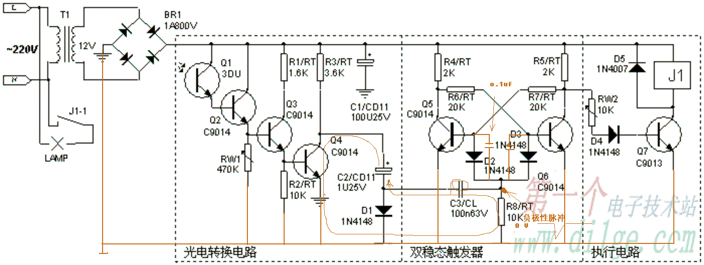 引用引用第31樓風流過客flgk于2011-01-19 20:55發表的 : 謝謝工控學子的多次指點我把光電電路和雙穩態電路分離開,把光敏電阻用10K電阻替代。并把10K電阻的正電源端懸空以作碰觸。C2換為10UF.未觸發時,C2與D1中間和地之間的電壓為幾毫伏,觸發時電壓為—14V,(RW1調至330K),沒試驗幾次Q4燒毀,換新后,再試驗,幾次,Q4不觸發,因下班,未及查明原因 [attachment=54474]